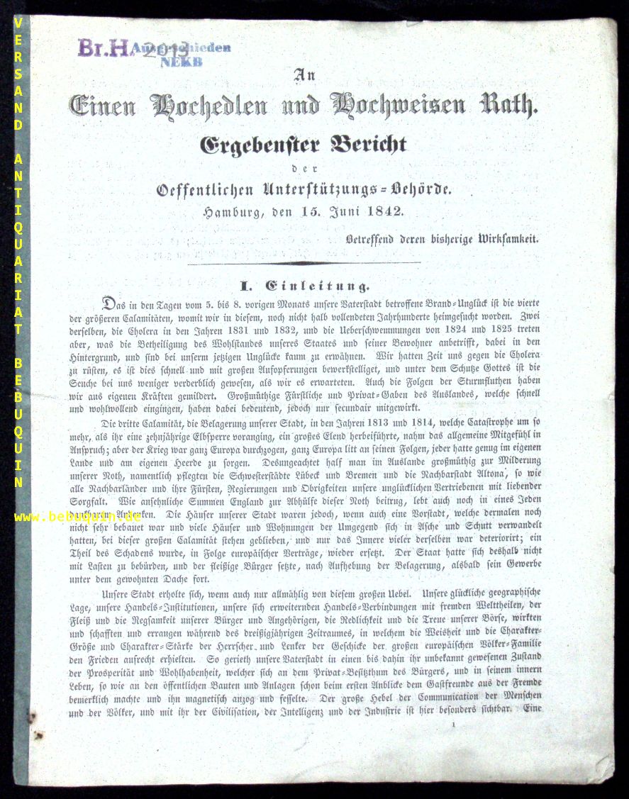 HAMBURG.– EDIKT.– AN EINEN HOCHEDLER UND HOCHWEISEN RATH.– Ergebenster Bericht der Oeffentlichen Unterstützungs-Behörden. Hamburg, 15.6.1842. 4°. 7 Bl. + eine große faltbare Tabelle mit allen durch den großen Brand zerstörten Häuser der Stadt. Interimsrücken. StaT. seltene EA dieses interessanten Dokuments zum Großen Brtand im Mai 1842.