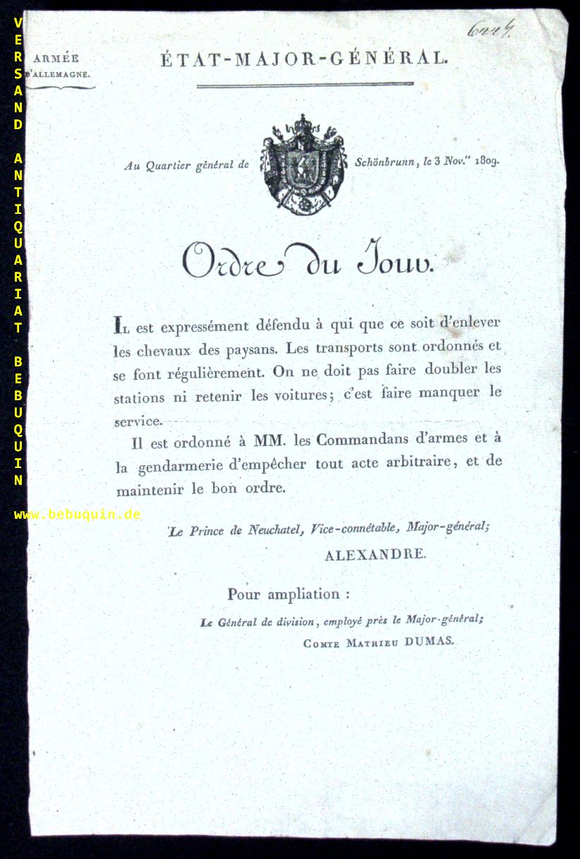 ÖSTERREICH.– BERTHIER, Alexandre (1753-1815), Marschall: Ordre du Jour wegen Pferdewagen. Schönbrunn, 03.11.1809. 30 x 20 cm. einseitig auf Hadernbütten mit gestochenem Wappen und dem Kopfdruck des Etat-Major-General. Interessantes Dokument zwei Wochen nach dem Frieden von Schönbrunn. Der Friede von Schönbrunn war ein Friedensschluss zwischen Napoleon Bonaparte und Franz I. von Österreich am 14. Oktober 1809 auf Schloss Schönbrunn. Das Kaisertum Österreich hatte den am 9. April 1809 begonnenen Fünften Koalitionskrieg gegen Frankreich verloren.