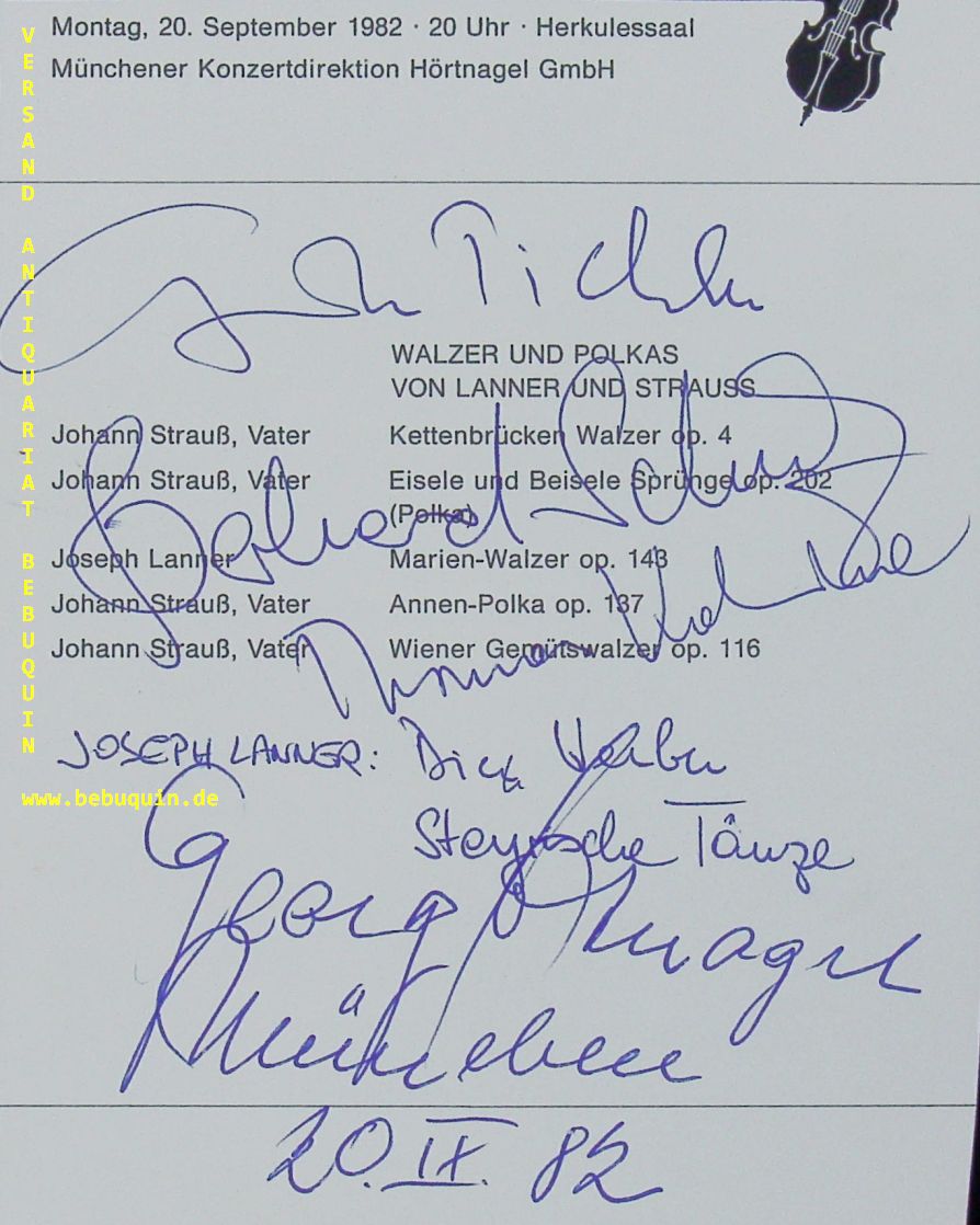HÖRTNAGEL, Georg (Bassist): eigenhändig signierte und datierte Programmseite. München (Philharmonie), 20.9.1982. 16,5 x 13,5 cm. 1 Bl. weitere Signaturen auf dem Programmblatt. Georg Hörtnagel hatte zwei Karrieren: Die des ausübenden Musikers, der mit dem Kontrabass die ganze Welt bereist hat und der mit dem Alban Berg Quartett, dem Amadeus-Quartett und Benjamin Britten, mit Martha Argerich, Svjatoslav Richter, Gidon Kremer oder Christoph Eschenbach auftrat – rund 800 Mal hat er weltweit in Franz Schuberts „Forellenquintett“ den Bass gespielt. Und die des Impresarios, der über 55 Jahre das Konzertleben Münchens maßgeblich mitgestaltet hat. Bereits im Alter von zwölf Jahren wusste er: „Ich will ein Leben in der Musik.“ (Hörtnagel)