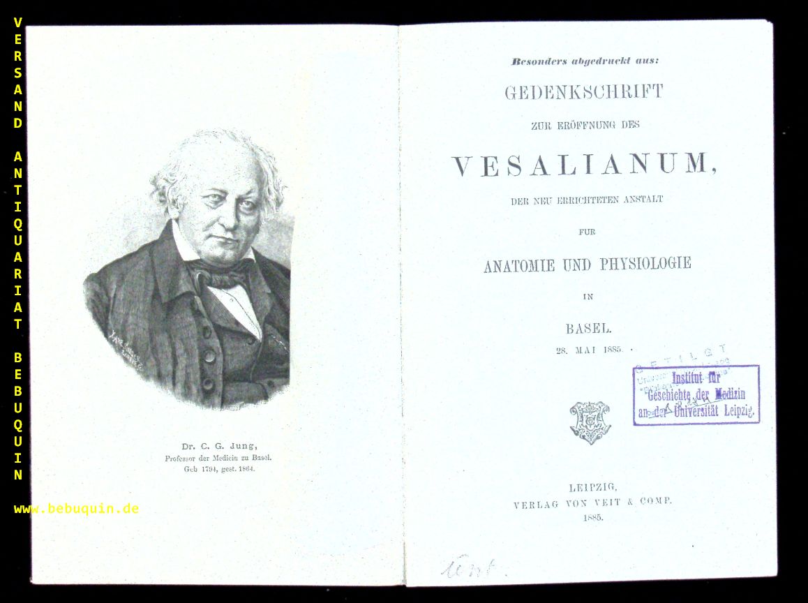 MEDIZIN.– HIS, Wilhelm: Zur Geschichte des anatomischen Unterrichtes in Basel. Leipzig (Veit), 1885. Gr. 8°. 48 S. mit gestochenem Titelportrait C.G. Jungs und der Ansicht des unteren Collegiums in Basel von 1850. HLn der Zeit. Ordnungsgemäß ausgesondertes Bibliotheksexemplar (Rückenschild, Stempel). EA. Wilhelm His (* 9. Juli 1831 in Basel; † 1. Mai 1904 in Leipzig) war ein schweizerisch-deutscher Anatom und einer der bedeutendsten Neuroanatomen seiner Zeit sowie Mitbegründer der Embryologie. (Wikipedia)