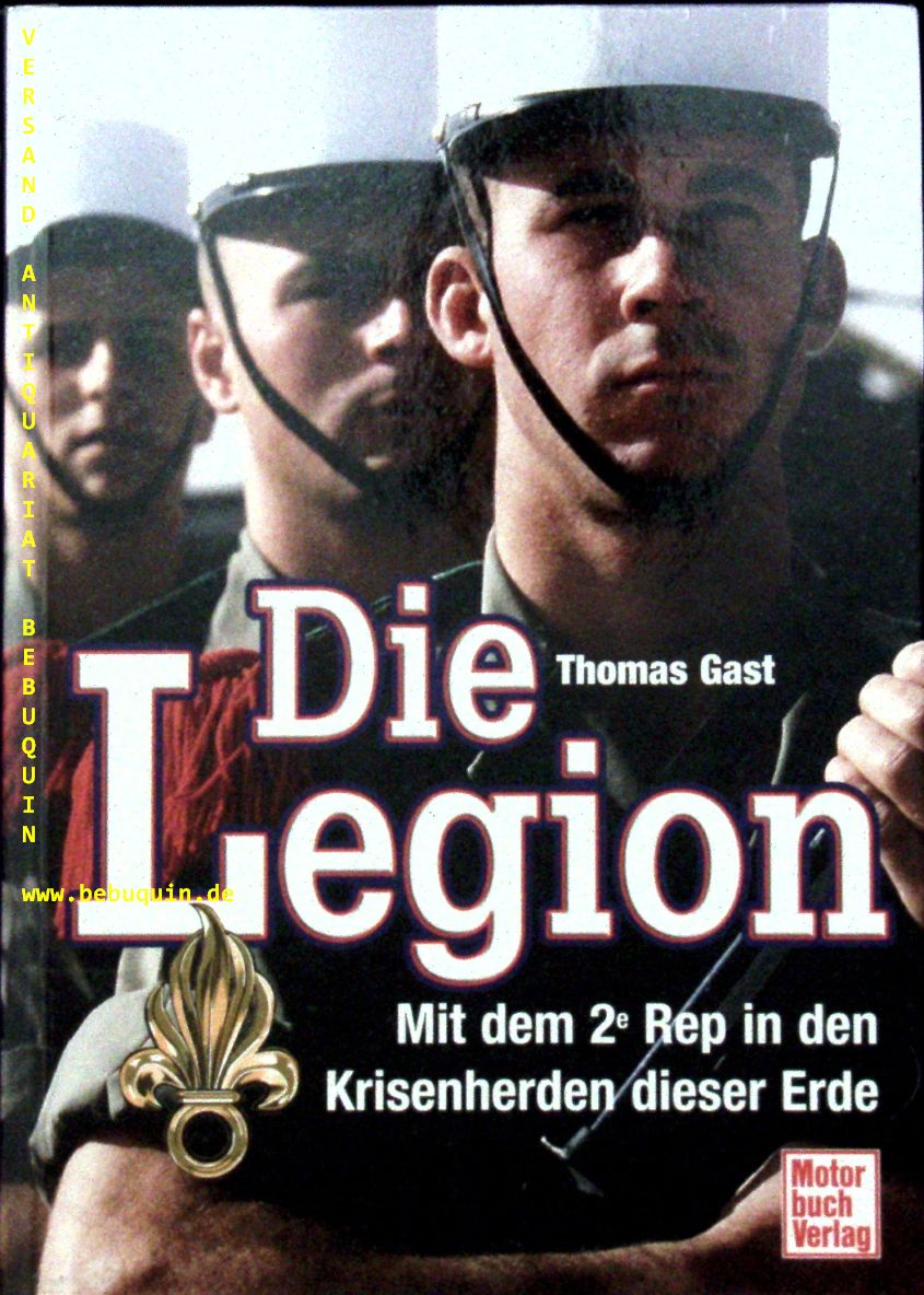 GAST, Thomas: Die Legion. Mit dem 2e Rep in den Krisenherden der Erde. Stuttgart (Motorbuch), 2010. Gr. 8°. 279 (1) S. mit zahlr. farb Abb. fol. farb ill. OPb. Ordnungsgemäß aus Bundeswehrbeständen ausgesondertes Bibliotheksexemplar (Rückenschild, Stempel). EA.