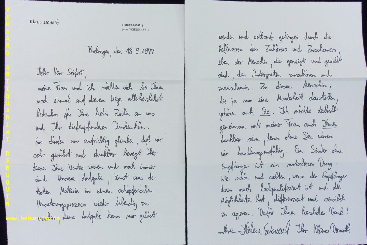 DONATH, Helen (Sopran) + Klaus (Pianist): eigenhändig 2seitiger datierter und von beiden signierter Brief an den Autogrammsammler Willi Seifert auf Kopfbogen. „. . .meine Frau und ich möchten sich bei Ihnen bedanken. (…) Unsere Aufgabe, Kunst aus der toten Materie in einem schöpferischen Umsetzungsprozess wieder lebendig zu machen, (…) kann nur vollauf gelingen durch die Reflexion des Zuhörers (…) Zu diesen Menschen, die ja nur eine Minderheit darstellen, gehören auch Sie. Ich möchte deshalb gemeinsam mit meiner Frau auch Ihnen dankbar sein, denn ohne Sie wären wir handlungsunfähig. Ein Sender ohne Empfänger ist ein nutzloses Ding.“ Wedemark. 18.9.1977. 29 x 21 cm. 2 Bl. + ein Antwortschreiben Seiferts in Kopie anbei. Helen Donath, geborene Helen Erwin, (* 10. Juli 1940 in Corpus Christi, Texas) ist eine US-amerikanische Opernsängerin (Sopran).(Wikipedia)