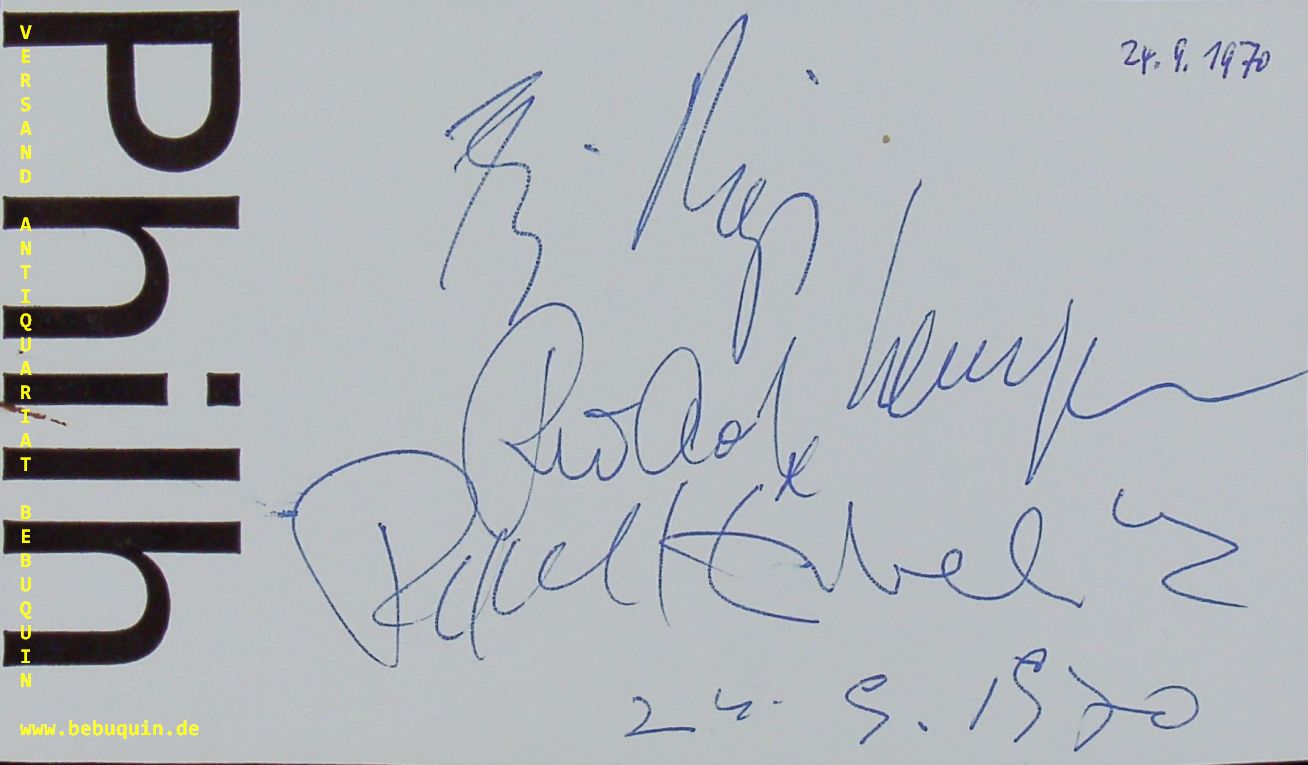 KUBELIK, Rafael + KEMPE, Rudolf (Dirigenten): eigenhändig von beiden signiertes Programmblatt. München, 24.9.1970. 10 x 17,5 cm. 1 Bl. + Das Programmheft der zweiten Deutschland-Tournee des Tonhalle-Orchesters Zürich 1972. Rudolf Kempe (* 14. Juni 1910 in Dresden; † 12. Mai 1976 in Zürich) war ein deutscher Dirigent. (Wikipedia)
