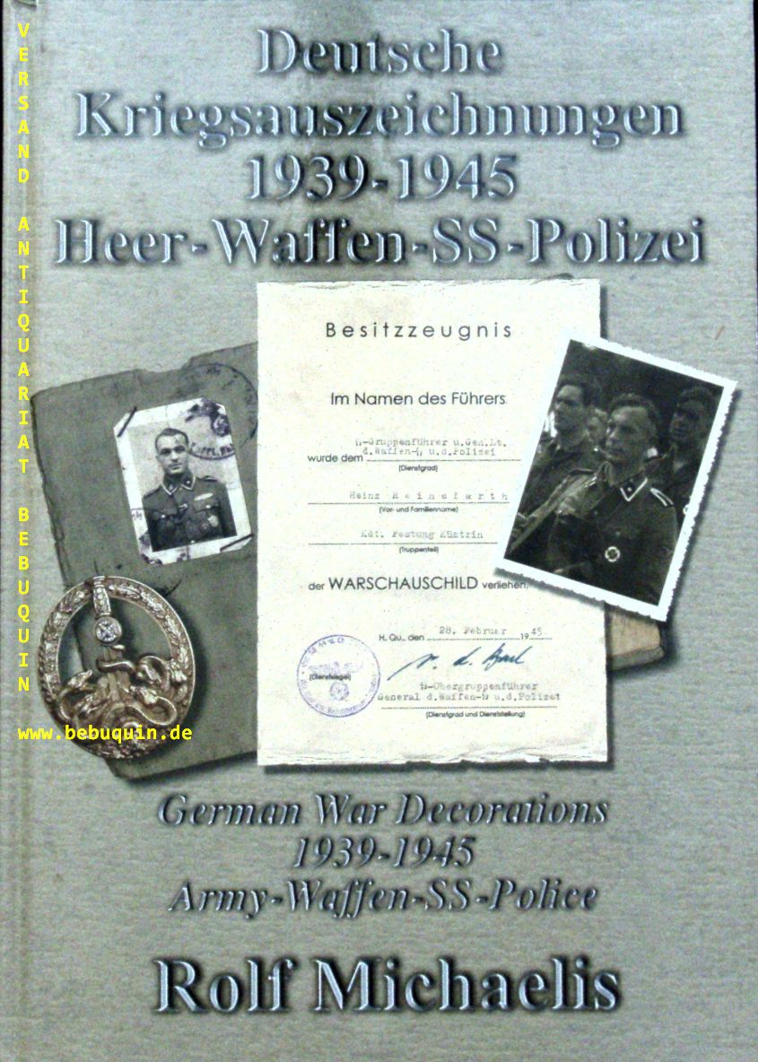 2. WELTKRIEG.– MICHAELIS, Rolf: Deutsche Kriegsauszeichnungen 1939 – 1945. Heer – Waffen-SS – Polizei. German War Decorations 1939 – 1945. Army – Waffen-SS – Police. Dresden (Winkleried), 2007. 4°. 129 (1) S. mit zahlr., teils farb. Abb. ill OPb. Ordnungsgemäß aus Bundeswehrbeständen ausgesondertes Bibliotheksexemplar (Stempel und Rückenschild).