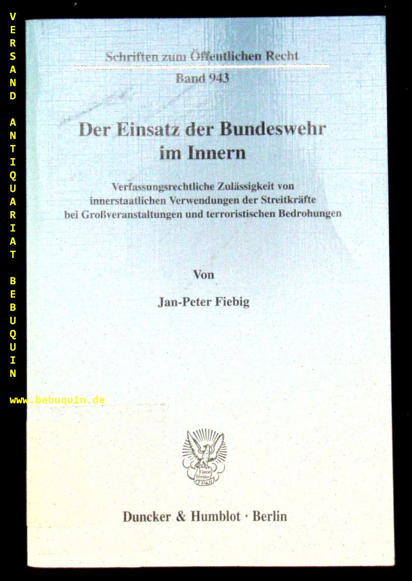 FIEBIG, Jan Peter: Der Einsatz der Bundeswehr im Innern. Verfassungsrechtliche Zulässigkeit von innerstaatlichen Verwendungen der Streitkräfte bei Großveranstaltungen und terroristischen Bedrohungen. Berlin (Duncker & Humblot), 2004. Gr. 8°. 467 (1) S. OBr. Ordnungsgemäß aus Bundeswehrbeständen ausgesondertes Bibliotheksexemplar (Rückenschild, Stempel). = Schriften zum Öffentlichen Recht, Bd. 943. EA. Diss.