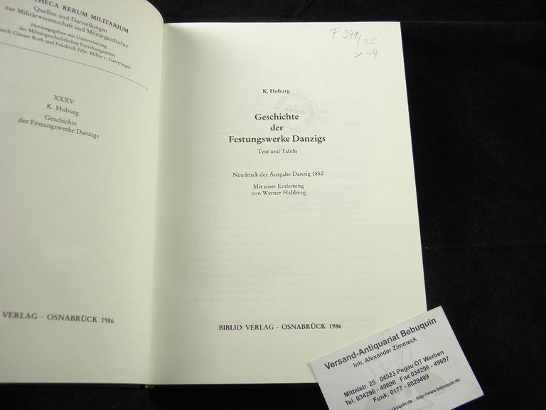 OSTGEBIETE.– HOBURG, K.: Geschichte der Festungswerke Danzig. Text und Tafeln. Neudruck der Ausgabe Danzig 1852. Osnabrück (Biblio), 1986. Gr. 8°. VII (+I) S., 4 Bl., 184 S., 1 Bl., und 21 teils doppelblattgroße Tafeln OKunstleder mit Goldprägung. Ordnungsgemäß aus Bundeswehrbeständen ausgesondertes Bibliotheksexemplar (Stempel, Rückenschild), feines Ex. = Bibliotheca Rerum Militarium, Bd. XXXV.