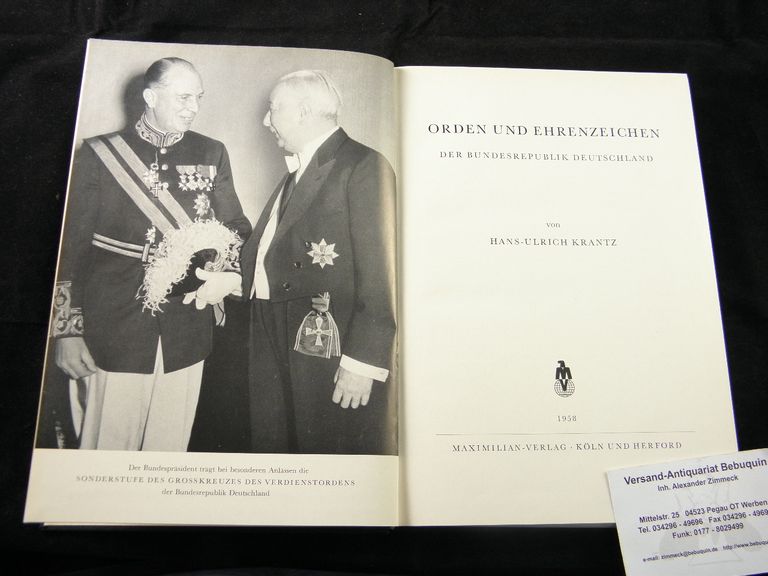 KRANTZ, Hans-Ulrich: Orden und Ehrenzeichen der Bundesrepublik Deutschland. Köln (Maximilian), 1958. Gr. 8°. 260 S. mit zahlr. Bildern. ill. OLn. Ordnungsgemäß aus Bundeswehrbeständen ausgesondertes Bibliotheksexemplar (Stempel, Rückenschild). EA.