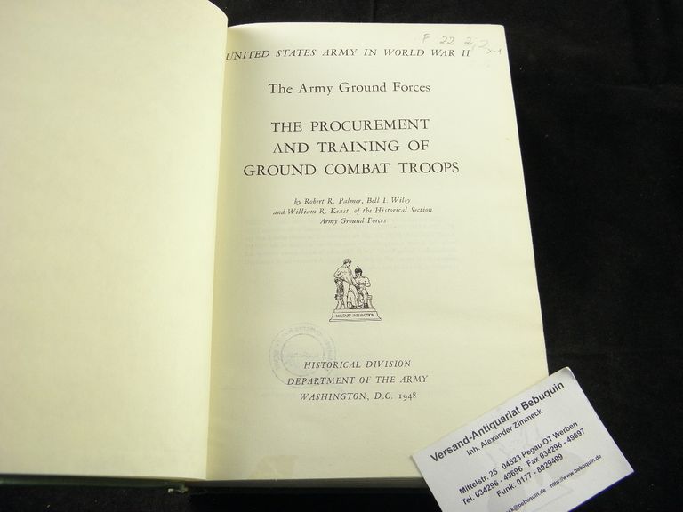 2. WELTKRIEG.– PALMER, Robert R. + WILEY, Bell I. + KEAST, William R.: The Army Ground Forces. The Procurement and Training of Ground Combat Troops. Washington (Office of the Chief of Military History), 1948. Gr. 8°. XI, 696 S. mit zahlr. Falttafeln. grünes OLn mit goldgeprägter Deckelvignette. Ordnungsgemäß aus Bundeswehrbeständen ausgesondertes Bibliotheksexemplar (Stempel, Rückenschild). = United States Army in World War II.