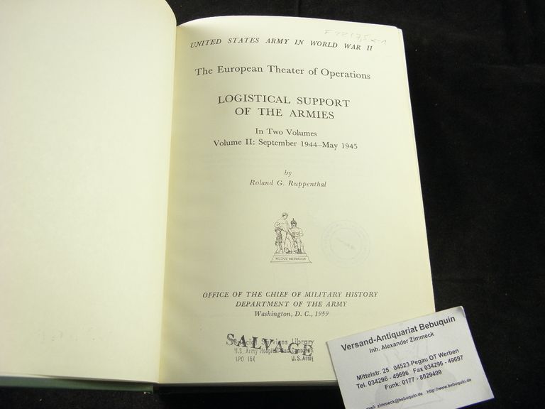 2. WELTKRIEG.– RUPPENTHAL, Roland G.: The European Theater of Operations. Logistical Support of the Armies. Vol II: September 1944 – May 1945. Washington (Office of the Chief of Military History), 1959. Gr. 8°. XVI, 540 S. mit zahlr. Abb. grünes OLn mit goldgeprägter Deckelvignette. Ordnungsgemäß aus Bundeswehrbeständen ausgesondertes Bibliotheksexemplar (Stempel, Rückenschild). = United States Army in World War II.