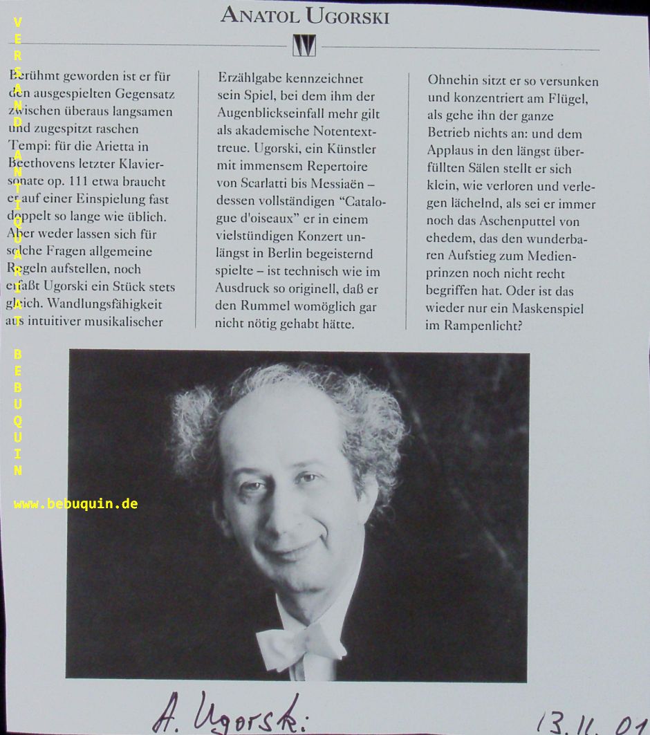 UGORSKI, Anatol (Pianist): eigenhändig signierte und datierte Portraitseite. München (Philharmonie), 13.11.2001. 17 x 17 cm. 1 Bl. Anatol Ugorski (* 28. September 1942 in Rubzowsk, Sibirien) ist ein russischer Pianist, der seit 1990 in Deutschland lebt und international gastiert. Anatol Ugorski kam als viertes von fünf Geschwistern zur Welt. 1945 zogen die Eltern nach Leningrad. Dort wurde er mit sechs Jahren in die an das Konservatorium angegliederte Spezialmusikschule aufgenommen, obwohl er nur singen und Xylophon spielen konnte. (…) Bei einem Leningrader Gastspiel von Pierre Boulez, das in einer Zeit relativer kultureller Offenheit vor dem Prager Frühling arrangiert worden war und dann im Herbst 1968 (kurz nach dem Einmarsch von Truppen des Warschauer Pakts) stattfand, wurde sein begeisterter Applaus als politische Demonstration gedeutet. Er musste sich vor einem Komitee verantworten. Da man ihn aufgrund seiner Liebe zur zeitgenössischen Musik für politisch unzuverlässig hielt, wurde er an der Fortsetzung seiner Karriere gehindert und konnte mehr als zehn Jahre lang nur vor Schulklassen in der sowjetischen Provinz auftreten.