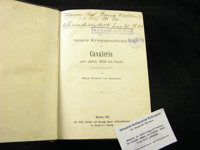 PFERDE.– ROTENHAN, Freiherr von: Die neuere Kriegsgeschichte der Cavalerie vom Jahre 1859 bis heute. München (Roth), 1891. Gr. 8°. 502 (1) S. HLdr der Zeit. Ordnungsgemäß aus Bundeswehrbeständen ausgesondertes Bibliotheksexemplar (Stempel, Rückenschild), Kanten berieben. EA.