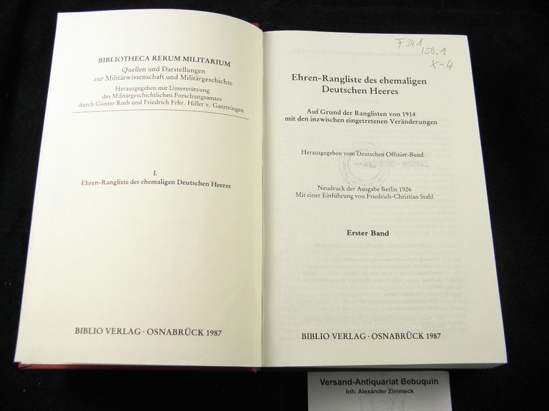 EHREN-RANGLISTE DES EHEMALIGEN DEUTSCHEN HEERES.– Auf Grund der Ranglisten von 1914 mit den inzwischen eingetretenen Veränderungen. Hrsg. vom Deutschen Offizier-Bund. Neudruck der Ausgabe Berlin 1926. 1. Bd. (von 2). Osnabrück (Biblio), 1987. XVII, 650 S. dunkelweinroter OLn mit Goldprägung. Ordnungsgemäß aus Bundeswehrbeständen ausgesondertes Bibliotheksexemplar (Rückenschild und Stempel).