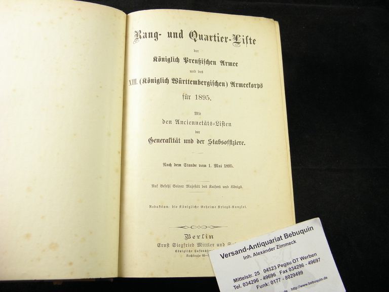 RANG- UND QUARTIER-LISTE DER KÖNIGLICH PREUSSISCHEN ARMEE UND DES XIII. (Königlich Württembergischen) ARMEEKORPS FÜR 1896.– Mit den Anciennetäts-Listen der Generalität und der Stabsoffiziere. Berlin (Mittler), 1.5.1895 XXIV, 1281 (5) S. OHLn mit goldgeprägtem Rücken. Rücken geblichen.