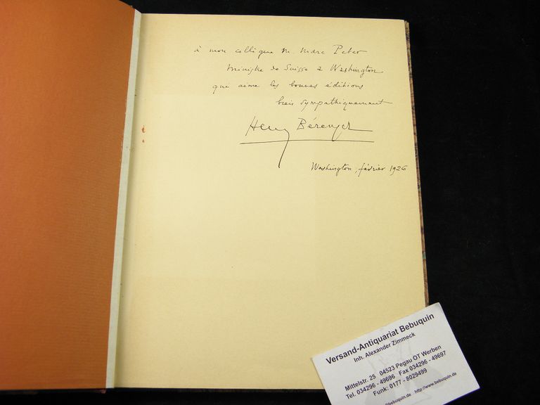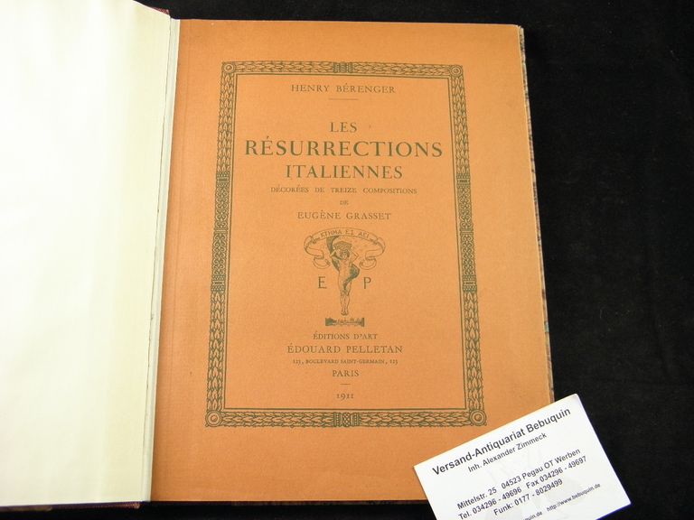 BERENGER, Henry: Les résurrections italiennes. Paris (Édouard Pelletan), 1911. 4°. 73 S., 3 Bl. décorées de treize compositions de Eugène Grasset. HLn der Zeit mit eingebundenem OKart. feines Ex. EA mit einer 6zeiligen eigenhändigen vom Verfasser voll signierten und datierten Widmung als französischer Konsul an den Schweizer Konsul in Washington auf Vorsatz. Henry Bérenger (* 22. April 1867 in Rugles, Département Eure; † 18. Mai 1952 in Saint-Raphaël) war ein französischer Politiker. (Wikipedia). Er war 1926/27 als französischer Konsul in den USA tätig.