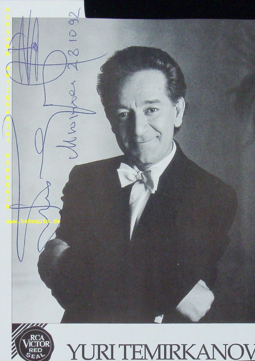 TEMIRKANOV, Yuri (Dirigent): eigenhändig signierte und datierte Portraitseite. München (Philharmonie), 28.10.1992. 18,5 x 14 cm. 1 Bl. Juri Chatujewitsch Temirkanow (* 10. Dezember 1938 in Naltschik, damals Kabardino-Balkarische Autonome Sozialistische Sowjetrepublik, Sowjetunion) ist ein russischer Dirigent. Er wurde in eine Familie geboren, die der Volksgruppe der Kabardiner angehört. Sein Studium in den Fächern Viola und Dirigieren absolvierte er am Sankt Petersburger Konservatorium, an dem er durch Ilja Musin zum Dirigenten ausgebildet wurde. Yuri Temirkanov ist seit 1988 Künstlerischer Direktor und Chefdirigent der Sankt Petersburger Philharmoniker.