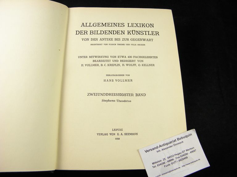 THIEME / BECKER.– VOLLMER, Hans: (Hrsg.) Allgemeines Lexikon der bildenden Kunst von der Antike bis zur Gegenwart. 32. Bd. Stephens – Theodotos. Leipzig (Seemann), 1938. 4°. 600 S. OHldr mit goldgeprägtem Rücken. tadellos