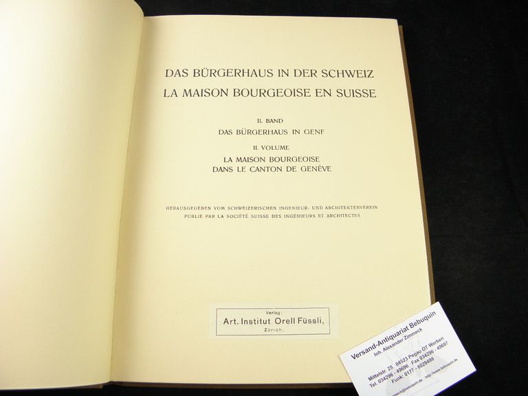 ARCHITEKTUR.– SCHWEIZERISCHER INGENIEUR- UND ARCHITEKTENVEREIN: (Hrsg.) Das Bürgerhaus in Genf. La maison bourgeoise dans le canton de Genève. Zürich (Orell Füssli), 1912. Gr. 4°. XXXIX S. + 107 Bildtafeln. OLn. feines Ex. = Das Bürgerhaus in der Schweiz, II. Band. EA der zweisprachigen Ausgabe deutsch und französisch.