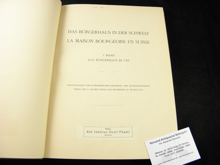 ARCHITEKTUR.– SCHWEIZERISCHER INGENIEUR- UND ARCHITEKTENVEREIN: (Hrsg.) Das Bürgerhaus in Uri. Zürich (Orell Füssli), 1909. Gr. 4°. LVI S. + 104 Bildtafeln. OLn. feines Ex. = Das Bürgerhaus in der Schweiz, I. Band. EA. Zwesprachige Ausagbe.