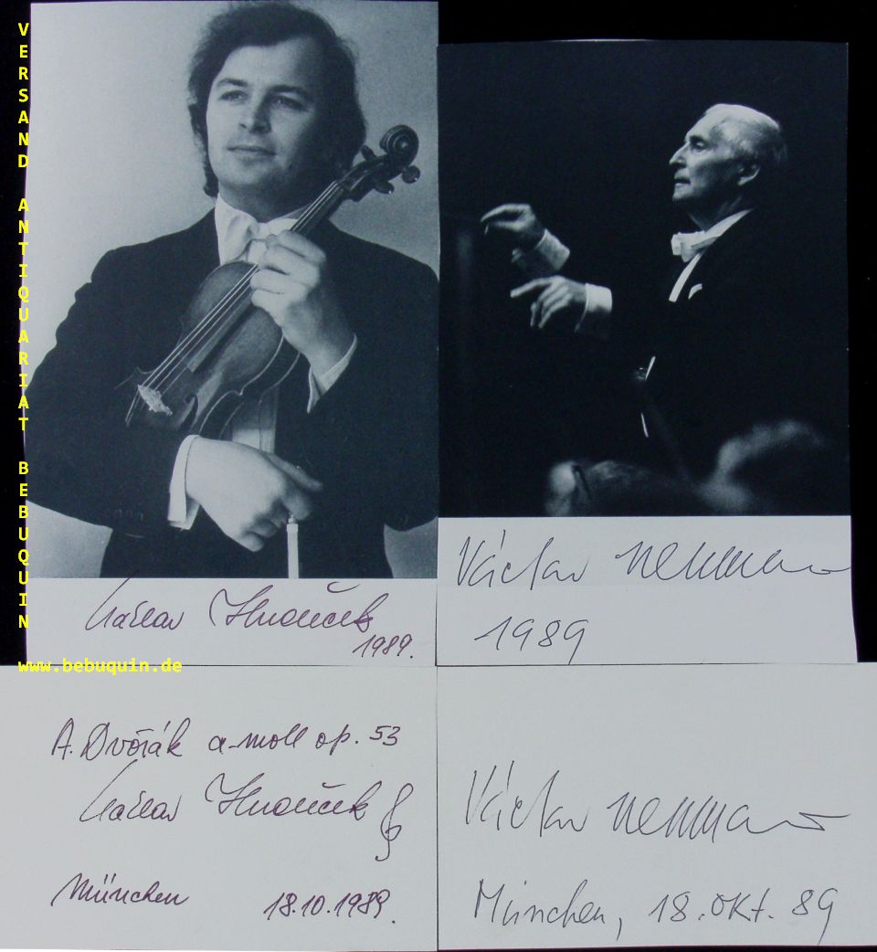 NEUMANN, Vaclav (Dirigent) + Vaclav Hudecek (Violinist): 2 eigenhändig von beiden datierte und signierte Portraitseiten sowie ebenfalls vonbeiden datierte und signierte Autogrammkarten. München (Philharmonie), 18.10.1989. 19 x 11 cm. 4 Bl. Václav Neumann (* 29. September 1920 in Prag; † 2. September 1995 in Wien) war ein tschechischer Dirigent, Violin- und Viola-Spieler. Václav Hudecek (born June 7, 1952 in Rožmitál pod Tremšínem, Czechoslovakia) is a Czech violinist. A former student of David Oistrakh, Hudecek’s records have sold many copies in the Czech Republic, especially a 1992 recording of Vivaldi’s The Four Seasons, certified platinum. Hudecek also runs an annual academy for promising young Czech violinists. (Wikipedia)