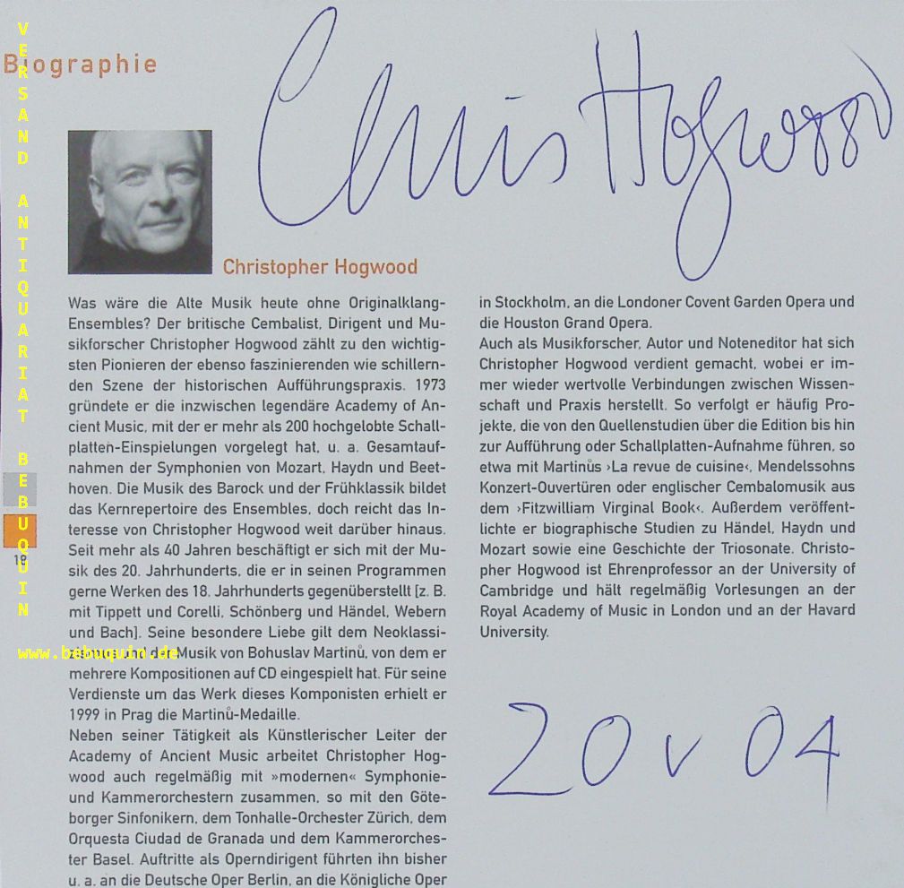HOGWOOD, Christopher (Dirigent): eigenhändig signierte und datierte Portraitseite. München (Philharmonie), 20.5.2005. 17,5 x 18 cm. 1 Bl. Christopher Hogwood (* 10. September 1941 in Nottingham; † 24. September 2014 in Cambridge) war ein britischer Cembalist und international bekannter Dirigent. (Wikipedia)