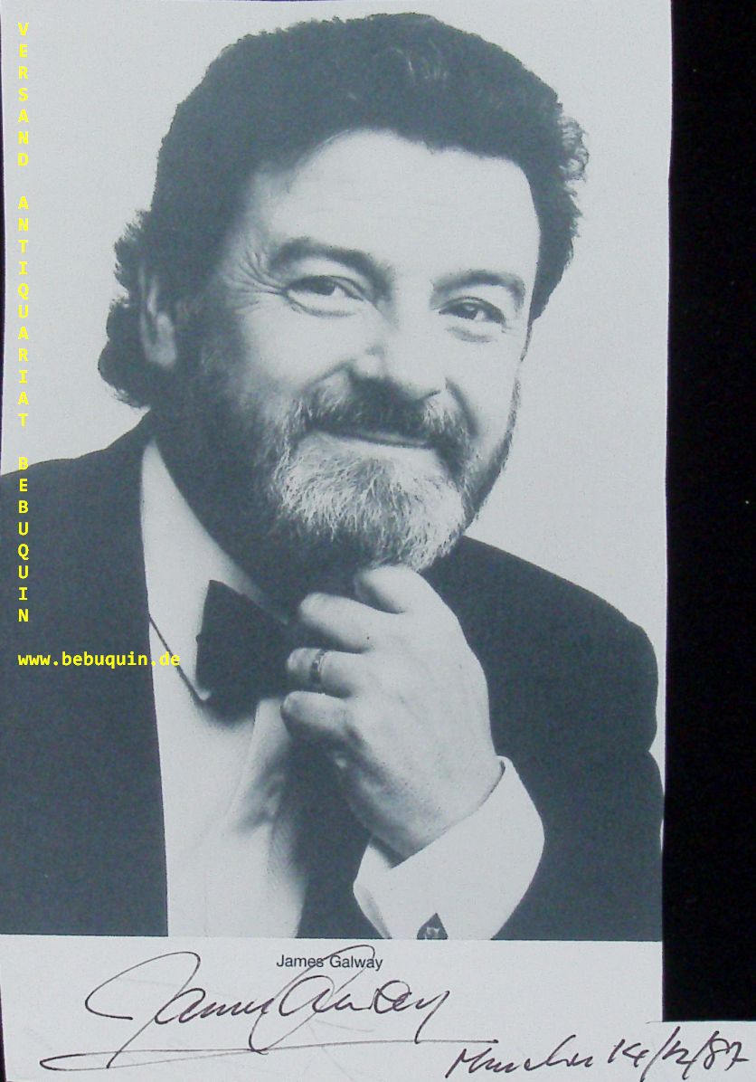 GALWAY, James (Flötist): eigenhändig signierte und datierte Portraitseite. München (Philharmonie), 14.12.1987. 18,5 x 11,5 cm. 1 Bl. Sir James Galway (* 8. Dezember 1939 in Belfast, Nordirland) gilt als einer der bedeutendsten klassischen Flötisten des späten 20. und frühen 21. Jahrhunderts. Als einer der ersten Flötisten wagte er eine Solokarriere ohne Bindung an ein Orchester und wurde damit erfolgreich. Galway ist berühmt für seine außergewöhnliche Virtuosität und sein ausdrucksstarkes Spiel mit unverwechselbarem Klang. Sein Beiname The Man with the Golden Flute („der Mann mit der goldenen Flöte“) stammt aus der Zeit seiner frühen Solokarriere, als Goldflöten noch sehr selten waren. (Wikipedia)