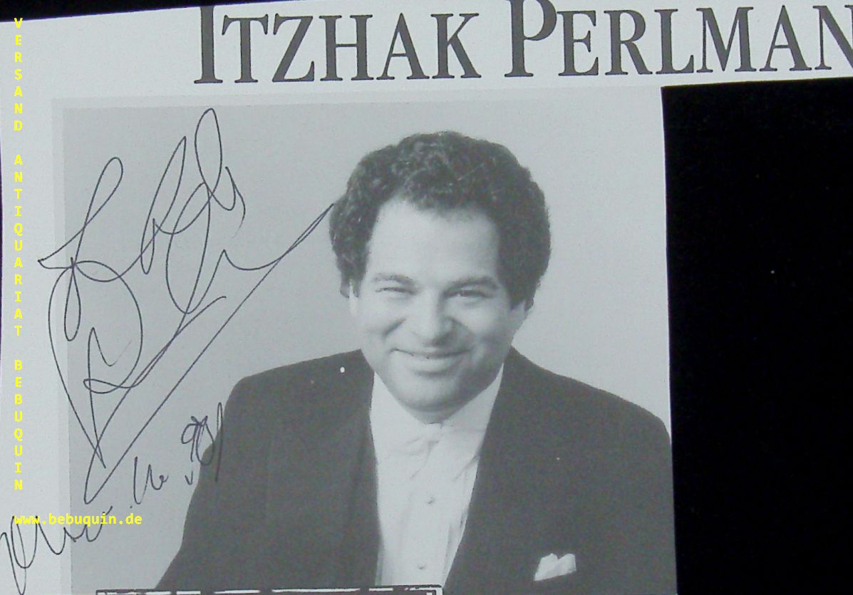 PERLMAN, Itzhak (Violinist): eigenhändig signiertes und datiertes Foto aus Programmheft. München, 16.11.1990. 11 x 16 cm 2 Bl. Itzhak Perlman (* 31. August 1945 in Tel Aviv) ist ein israelisch-amerikanischer Geiger, Dirigent und Musikpädagoge. Er gilt als einer der bedeutendsten Violinisten der zweiten Hälfte des 20. Jahrhunderts. Mit 4 Jahren erkrankte er an Poliomyelitis. Seine Ausbildung an der Violine begann er im Alter von 5 Jahren an der Schulamith-Akademie in seiner Heimatstadt, nachdem er die schlimmsten Folgen der Krankheit bereits überwunden hatte. Er ist jedoch infolge der Krankheit auf Gehhilfen angewiesen und spielt deswegen im Sitzen. (Wikipedia)