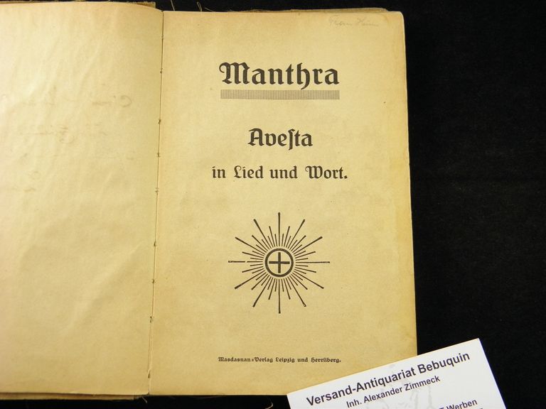 AMMANN, David: Manthra. Avesta in Lied und Wort. 3 Teile in einem Band. Leipzig (Masdasnan), 1918. 178 S., 46 S. OLn. Einband etwas gebräunt, Gelenke leicht gelockert. sehr seltene EA mit einer 4-zeiligen, eigenhändigen, voll signierten Verfasserwidmung auf fliegendem Vorsatz. David Ammann war ein schweizerisch-amerikanischer Autor, Übersetzer, Verleger und Begründer der Mazdaznan-Bewegung in Europa. Ab dem Jahr 1907 erlebte die von ihm entwickelte Glaubenslehre in Leipzig einen kometenhaften Aufstieg. Allerdings wurde auch die Polizei auf den charismatischen Prediger aufmerksam, sodass er noch vor Beginn des 1. Weltkriegs aus Sachsen ausgewiesen wurde.