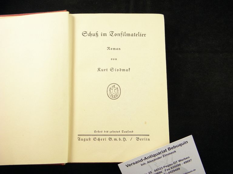 SIODMAK, Kurt: Schuß im Tonfilmatelier. Roman. Berlin (Scherl), 1930. kl. 8°. 194 (6) S. OLm. leicht schief gelesen.
