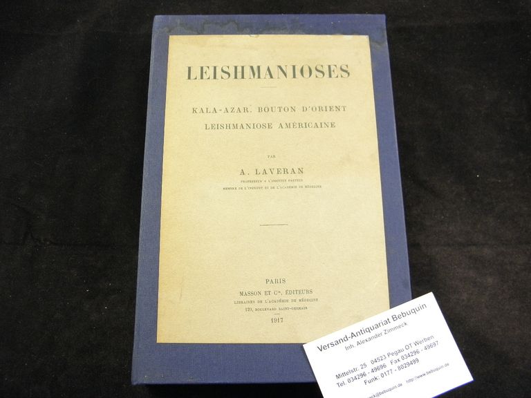 PARASITOLOGIE.– LAVERAN, Alphonse: Leishmanioses. Kala-Azar. Bouton d´Orient. Leishmaniose Américaine. Paris (Masson), 1917 Gr. 8°. III, 521 (26) S. mit 40 Abb. + 6 teils farb. Bildtafeln Neues Ln. mit mont. ODeckel. am Anfang mit starkem Wasserrand im Weiß, wenig gelockert. EA.Charles Louis Alphonse Laveran war ein französischer Mediziner und Bakteriologe, vor allem auf dem Gebiet der Tropenkrankheiten. Er erhielt 1907 den Nobelpreis für Physiologie oder Medizin.