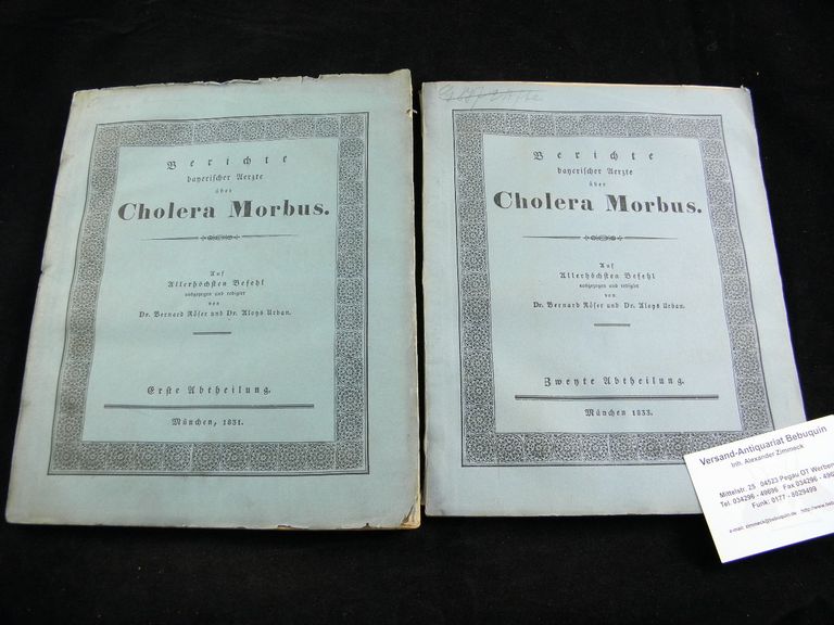 PARASITOLOGIE.– RÖSER, Bernhard + URBAN, Alons: Berichte bayerischer Aerzte über Cholera Morbus. 2 Abt. in 2 Bänden. München, 1832. 4°. VIII, 211 S. OBr. unaufgeschnitten und tadellos erhalten. EA.