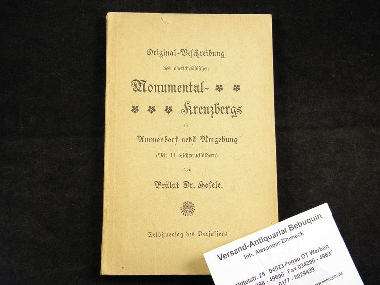 SCHWABEN.– HOFELE, Engelbert: Original-Beschreibung des oberschwäbischen Monumental-Kreuzbergs samt Pfarrei, Pfarrkirche, Pfarrschloß, Ummendorf, Kneippdenkmal, Jordanbad, Biberach, Ochsenhausen, und der ganzen hochinteressanten Umgebung ringsum. Ummendorf (Selbstverlag), ca 1900. kl. 8°. 112 (3) S. + 11 Lichtdruckbilder. OBr. Einband an einer Ecke minimal lädiert, sonst schönes Ex. EA. Prälat Dr. Engelbert Hofele, der päpstlicher Hausprälat, Ritter des Ordens vom hl. Grabe, Pilgerführer,