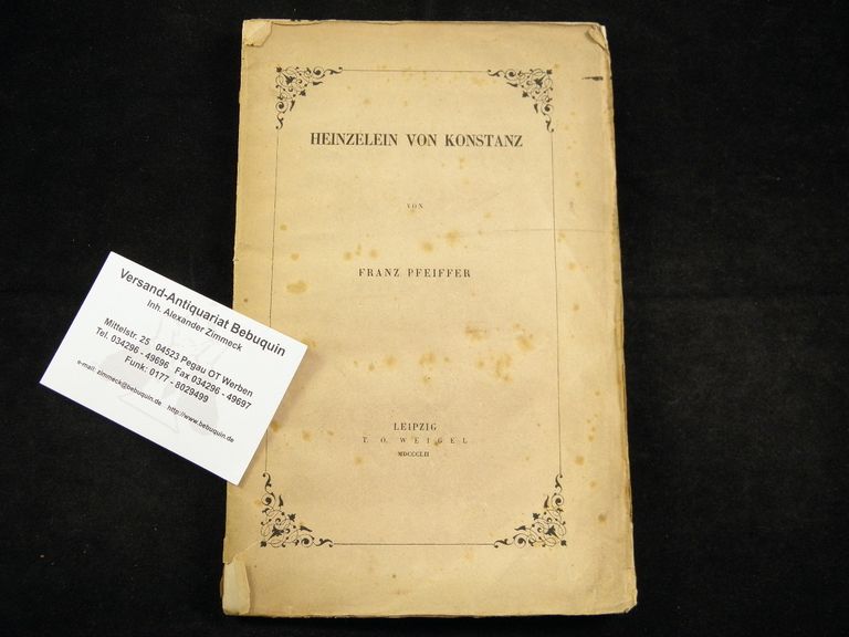 MITTELALTER.– PFEIFFER, Franz: (Hrsg.) Heinzelein von Konstanz. Leipzig (Weigel), 1852. XVII, 150 S. ill. OBr. unaufgeschnitten, teils etwas stockfleckig. EA dieser Testsammlung des mittelalterliche Dichters. Heinzelin war Küchenmeister des auch als Minnesänger bekannten Grafen Albrecht II. von Hohenberg (1235–1298). Heinzelin wurde mit seinen geistlichen und weltlichen Streitgedichten, insbesondere am Konstanzer Bischofshof bekannt. War Heinzelin einst die Autorschaft von Der Minne Lehre (Minnelehre) zugeschrieben worden, so belegte 1935 Käthe Mertens in ihrer Monographie zur Minnelehre per Urkundenforschung die Existenz des in nur einer Handschrift genannten Johann von Konstanz und führte weitere Thesen zur Verfasserfrage an. Heute gilt als gesichert, dass Heinzelin von Konstanz und Johann von Konstanz nicht identisch sind. Die beiden Texte, die Heinzelin nach wie vor zugeschrieben werden können, gehören der Gattung der Streitgespräche an: Von dem Ritter und von dem Pfaffen behandelt die Vorzüge der beiden genannten Stände, die durch ihre Vertreter ans Licht gesetzt werden; das Gedicht Von den zwein Sanct Joansen stellt in Form einer Vision den Rangstreit zwischen dem Täufer und dem Evangelisten Johannes dar. Fälschlicherweise hat Pfeiffer hier die Minnelehre gemeinsam mit den beiden Streitgesprächen herausgebracht, es ist dies aber die jüngste Ausgabe der zwei Texte Heinzelins: Heinzelein von Konstanz (Leipzig 1852)