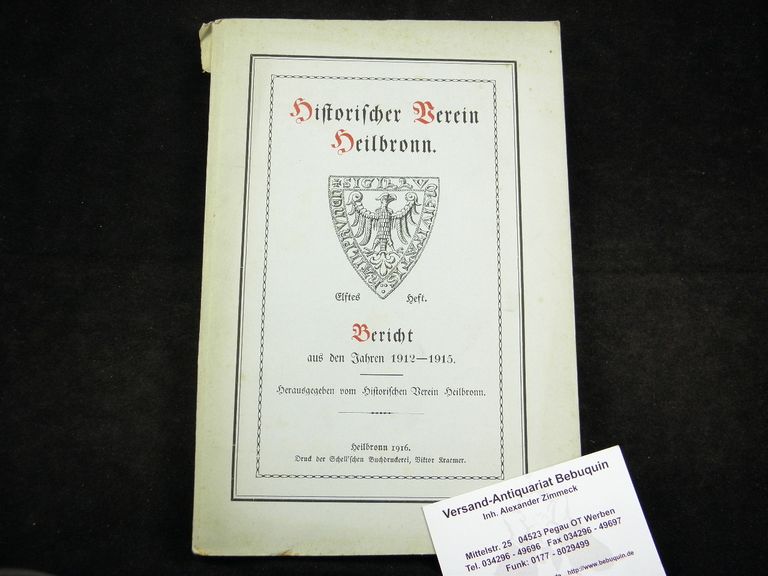 HEILBRONN.– HISTORISCHER VEREIN HEILBRONN: (Hrsg.) Bericht aus den Jahren 1912 – 1915. 11. Heft. Heilbronn (Schell), 1916. Gr. 8°. 168 S. mit zahlr. Abb. + 2 Portraittafeln. ill. OKart. oberes Kap leicht lädiert, sonst schönes Ex. Mit Beiträgen von Moritz von Rauch, Friedrich Dürr u.a.