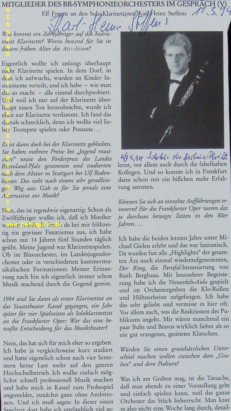 STEFFENS, Karl-Heinz (Dirigent): eigenhändig datierte und signierte Portraitseiten. Mit dem BR. München (Philharmonie), 17.3.1994. 23 x 13 cm. 1 Bl. Karl-Heinz Steffens (* 28. November 1961 in Trier) ist ein deutscher Dirigent und Klarinettist. Seit Herbst 2019 ist er Musikdirektor an der Staatsoper Prag. (Wikipedia)