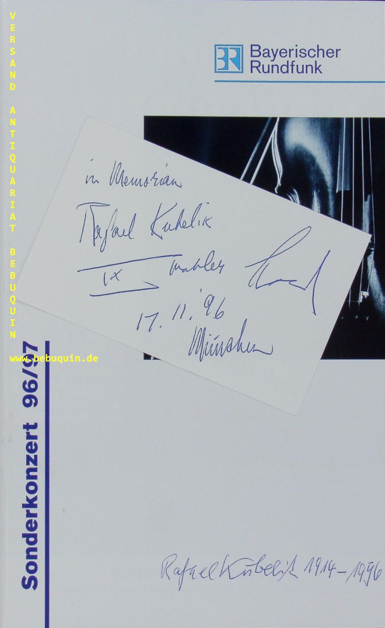 MAAZEL, Lorin (Dirigent) + RITZKOWSKY, Johannes (Hornist): eigenhändig datierte und signierte Autogrammkarten: in Memorian Rafael Kubelik (1914 – 1996). Mit dem Symphonieorchester des BR. München (Herkulessaal), 17.11.1996. 8 x12,5 cm. Karteikarten in Programmheft zum Sonderkonzert 1996/97.. 36 S. mit zahl. Abb. OKart. seltenes Zeitdokument.