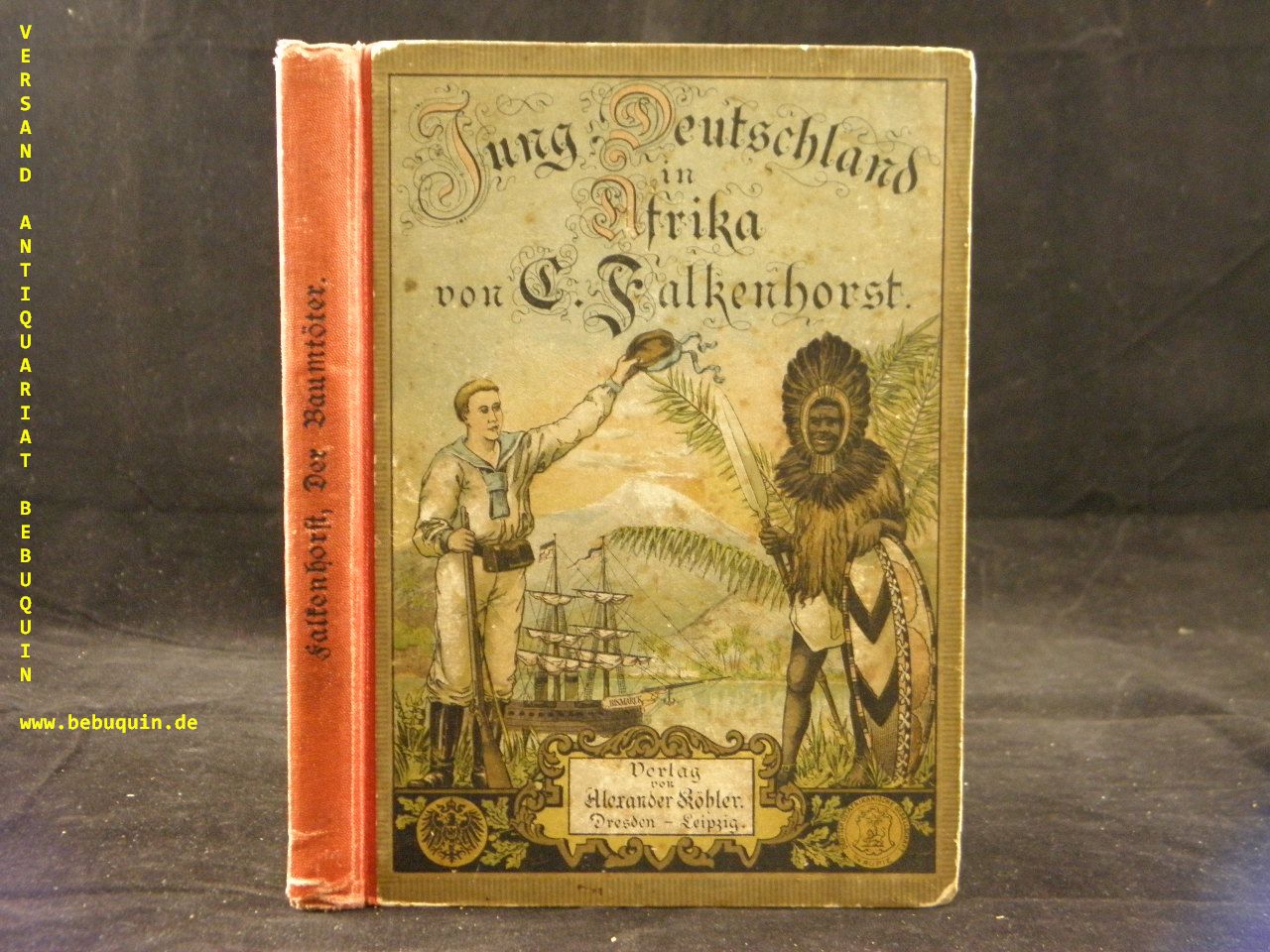 KOLONIEN.– FALKENHORST, C.: Der Baumtöter. Kameruner Pflanzergeschichte. Dresden (Köhler), ca 1899. 163 (7) S. mit zahlr. Illustrationen von Rud. Hellgrewe. farb. ill. OHLn. Kanten berieben, etwas gebäunt, teils braunfleckig, vorderes Gelenk gelockert. = Jung-Deutschland in Afrika. Kolonial-Erzählungen für jung und alt. Bd. 1. seltene EA im Originaleinband.