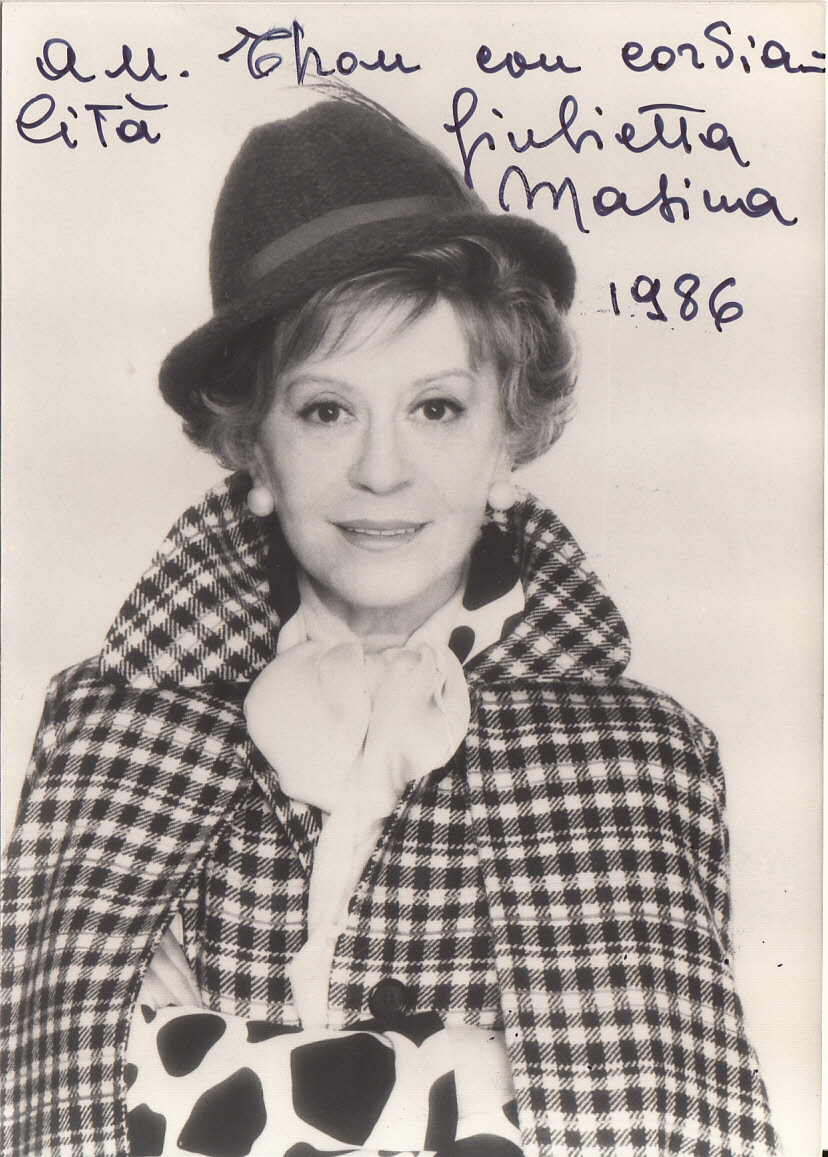 MASINA, Giulietta: eigenhändige Unterschrift mit persönlichem Gruß und Datum auf Original Foto. 0.O., 1986. 15 x 10,5 cm. S/W.