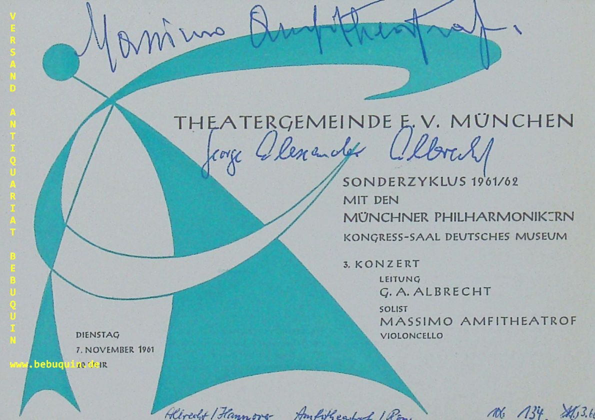 AMFITHEATROF, Massimo (Chellist) + ALBRECHT, George Alexander (Dirigent): eigenhändig von beiden signierter Programmzettel der Theatergemeinde. München 7.11.1961. 11 x 15 cm. 1 Blatt. Maksim Aleksandrovich Amfiteatrov (February 27, 1907 in Paris – December 19, 1990 in Levanto), known as Massimo Amfiteatrof, was a Russian-born Italian cellist, dubbed as the „Cellists’ Caruso“. (italian: il Caruso dei Violoncellisti) (Wikipedia)