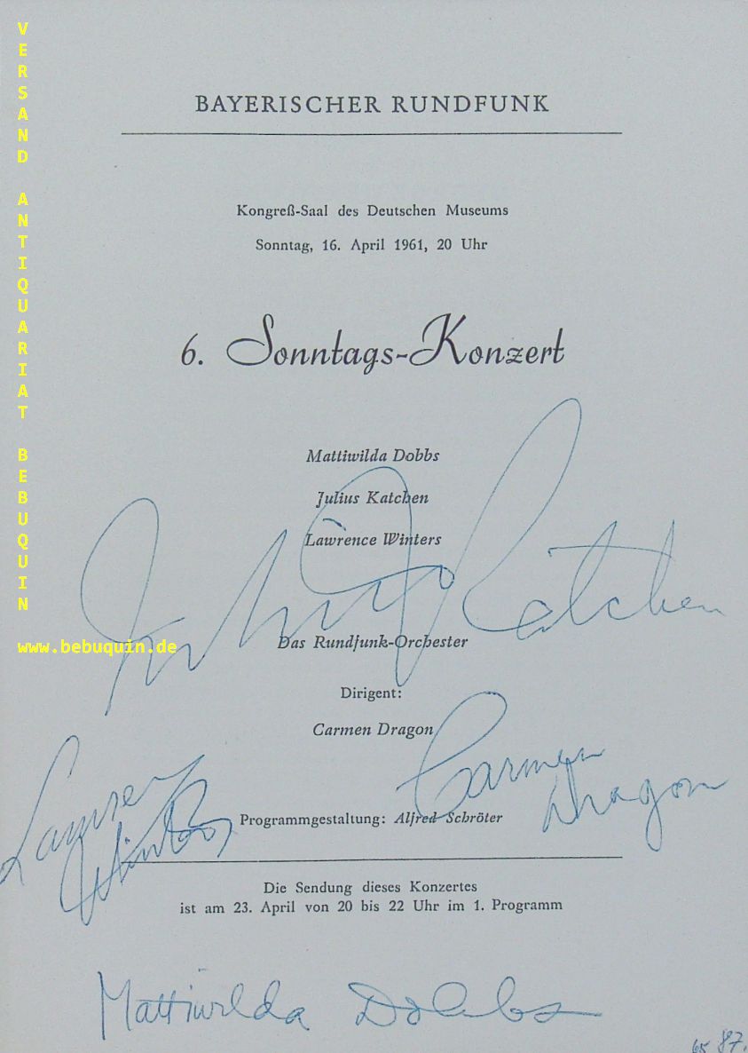 KATCHEN, Julius (Pianist) + DRAGON, Carmen (Dirigentin) + DOBBS, Mattiwilda + WINTERS, Lawrence: eigenhändig von allen signierte Programmseite. München 16.4.1961. 20 x 15cm. 3 Bl. Leporello. Julius Katchen (* 15. August 1926 in Long Branch, New Jersey; † 29. April 1969 in Paris) war ein US-amerikanischer Pianist russisch-jüdischer Abstammung. Katchens Repertoire war zwar zunächst breit, konzentrierte sich jedoch ab Ende der 1950er Jahre immer mehr auf die Werke von Johannes Brahms. Er nahm so auf Schallplatte dessen gesamtes Soloklavierwerk auf (eine bis heute in ihrer Kraft, Virtuosität und Werkdurchdringung maßstabsetzende Aufnahme). Am 11. Dezember 1968 nahm er am „Rock ‚n‘ Roll Circus“ der Rolling Stones teil. (Wikipedia)