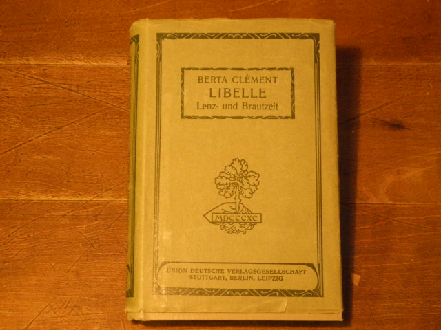 CLEMENT, Bertha: Libelle. Lenz- und Brautzeit. 14. Aufl. Stuttgart (Union), ca 1925. kl. 8°. 321 (4) S. mit den gestalteten Vorsätzen. farb. ll. OLn. mit OUmschl. gutes Ex. = Kränzchen-Bibliothek.