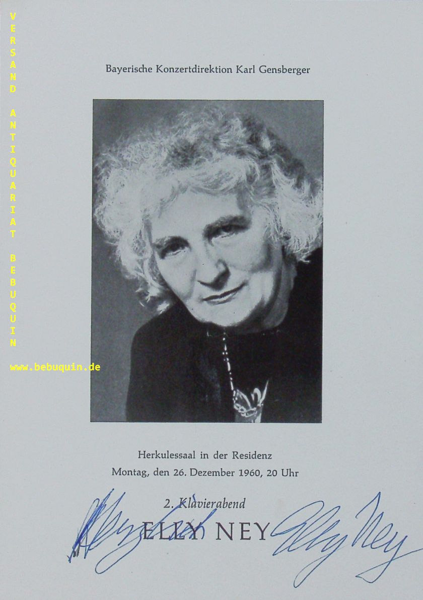 NEY, Elly (Pianistin): eigenhändig signierte Portraitseite: Herzlich. München (Herkulessaal), 26.12.1960. 21 x 15 cm. 1 Bl. Anbei eine Rüdel Portrait-Postkarte von Rosemarie Clausen.