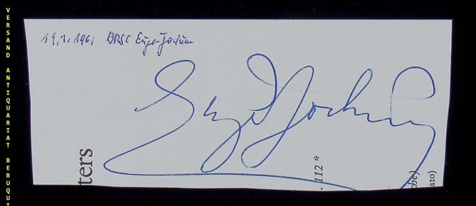 JOCHUM, Eugen ( Dirigent): eigenhändig signiertes Blatt. München (Herkulessaal), 19.1.1961. 17,5 x 24 cm. 1 Bl. leicht beschnitten. Eugen Jochum (* 1. November 1902 in Babenhausen, Schwaben; † 26. März 1987 in München) war ein deutscher Dirigent und zählt zu den bekanntesten Interpreten der Werke Anton Bruckners. (Wikipedia)