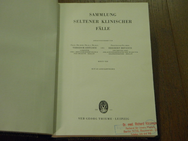 MEDIZIN.– BRUGSCH, Theodor + Herbert: (Hrsg.) Sammlung seltener klinischer Fälle. Heft VII – XI. in 1 Bd. Leipzig (Thieme), 1954 – 55. Gr. 8°. 105 S. mit 42 Abb.; 118 S. mit 77 Abb.; 142 S. mit 27 Abb. + 135 S. mit 75 Abb. HLn der Zeit mit goldgeprägtem Rücken. Ordnungsgemäß aus den Beständen der Volkspolizei ausgesondertes Bibliotheksexemplar (Rückenschild, Stempel), gutes Ex. EA. Karl Louis Theodor Brugsch (* 11. Oktober 1878 in Graz; † 11. Juli 1963 in Ost-Berlin) war ein deutscher Internist und Politiker. (Wikipedia)