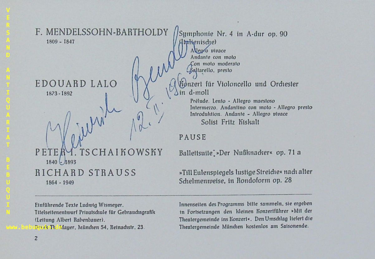 BENDER, Heinrich (Dirigent): eigenhändig signierte Programmseite der Theatergemeinde. München (Kongresssaal), 12.2.1963. 10,5 x 15 cm. 1 Bl. Heinrich Bender, eigentlich Heinrich Maul, (* 11. Mai 1925 in Saarbrücken; † 24. Mai 2016 in München) war ein deutscher Dirigent, Pianist und Musikpädagoge. In die neuere Interpretationsgeschichte ging er vor allem ein als Bayerischer Staatskapellmeister, Erster Dirigent am Münchner Nationaltheater und Leiter des Studios der Bayerischen Staatsoper München. (Wikipedia)