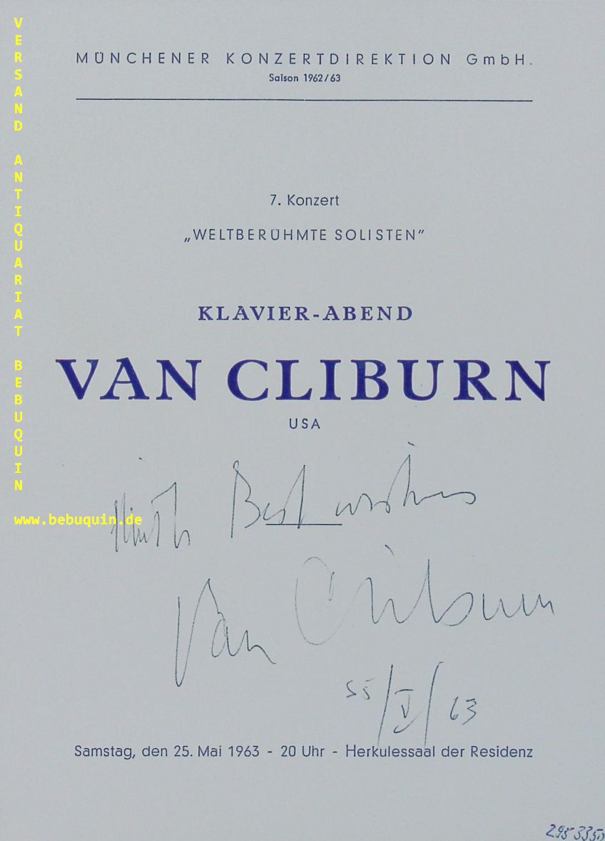 CLIBURN, Van (Pianist): eigenhändig signierte und datierte Programmseite: With Best wishes. München (Herkulessaal), 25.3.1963. 21 x 15 cm. 1 Bl. Van Cliburn (* 12. Juli 1934 als Harvey Lavan Cliburn jr. in Shreveport, Louisiana; † 27. Februar 2013 in Fort Worth, Texas) war ein US-amerikanischer Pianist. „Es gibt nur zwei unersetzbare Dinge“, hatte Cliburn kurz vor seinem Tod in einem seiner letzten Interviews gesagt: „Großartige Musik und wunderschöne Erinnerungen“. (Wikepedia)