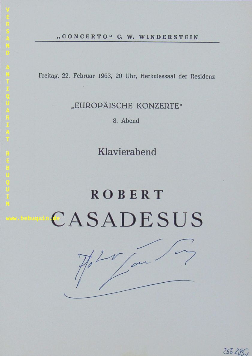 CASADESUS, Robert (Pianist): eigenhändig signierte Programmseite. München (Herkulessaal), 22.2.1963. 21 x 15 cm. 1 Bl. Robert Marcel Casadesus (* 7. April 1899 in Paris; † 19. September 1972 ebenda) war ein französischer Pianist, Klavierlehrer und Komponist. (Wikipedia)