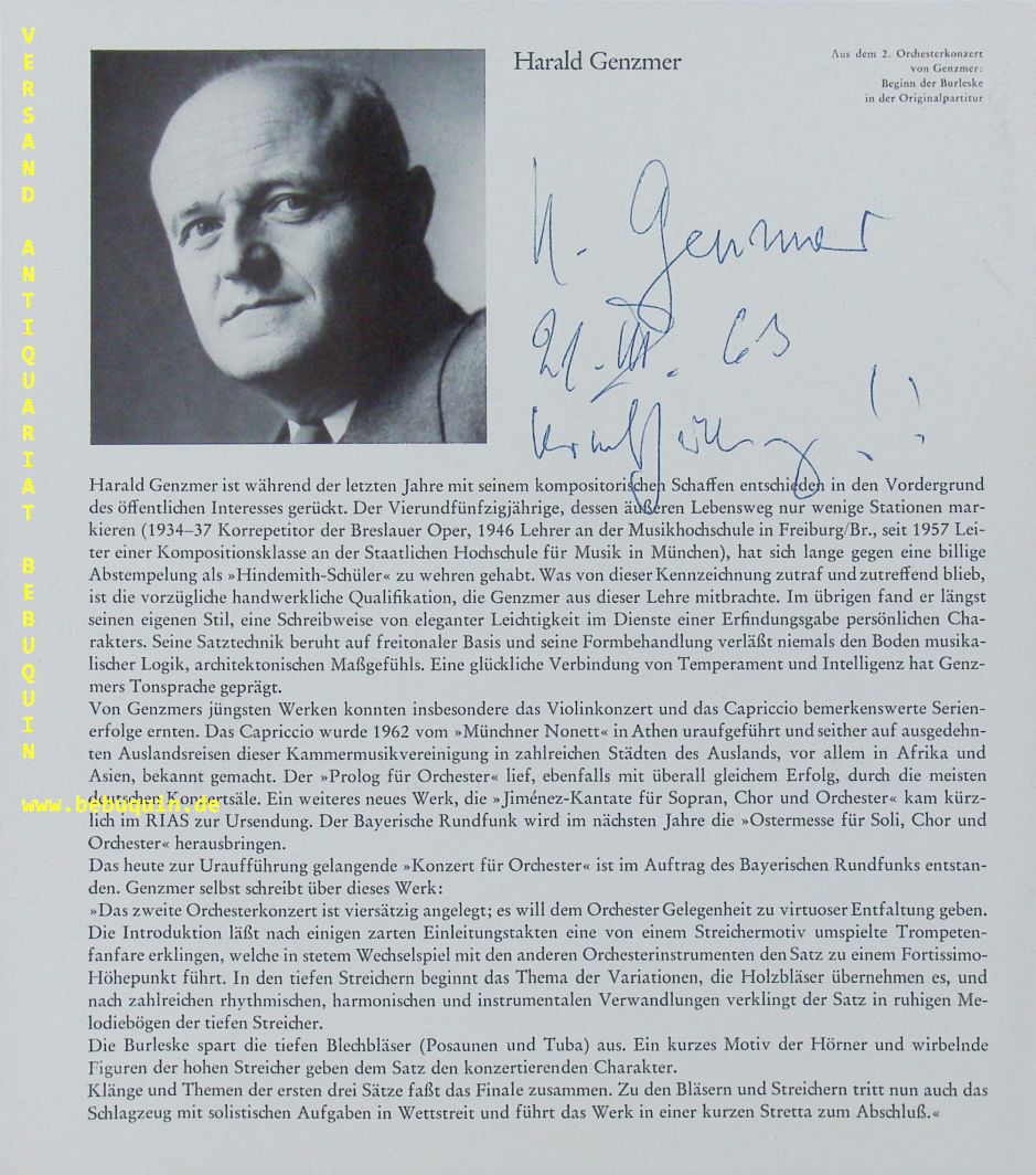 GENTMER, Harald (Komponist): eigenhändig signierte und datierte Portraitseite: Uraufführung !! München (Herkulessaal), 21.3.1963. 23,5 x 21 cm. 1 Bl. Harald Genzmer (* 9. Februar 1909 in Blumenthal, Provinz Hannover; † 16. Dezember 2007 in München) war ein deutscher Komponist. (Wikipedia)