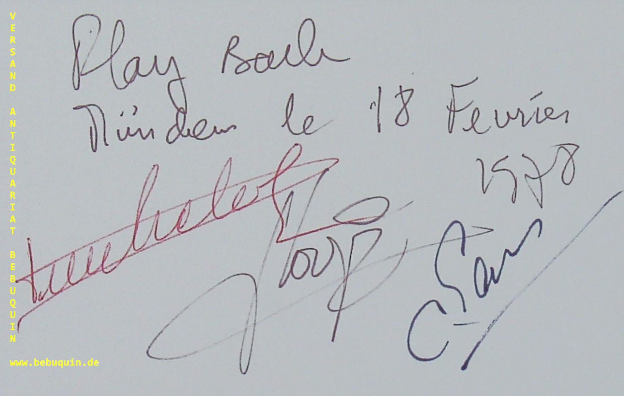 LOUSSIER, Jacques + MICHELOT, Pierre + GARROS, Christian: eigenhändig von allen drei Mitgliedern des Play Bach Trios signierte und datierte Autogrammkarte: Play Bach. München (Herkulessaal), 18.2.1978. 8 x 12,5 cm. Karteikarte. Jacques Loussier (* 26. Oktober 1934 in Angers; † 5. März 2019 in Blois) war ein französischer Pianist, Komponist und Arrangeur. Bekannt wurde er mit seinen verjazzten Interpretationen von Werken Johann Sebastian Bachs. Auf diese ungewöhnliche Kombination war Loussier 1959 während seines Studiums gestoßen und gründete dazu mit dem Bassisten Pierre Michelot und dem Schlagzeuger Christian Garros das Play Bach Trio. (Wikipedia)