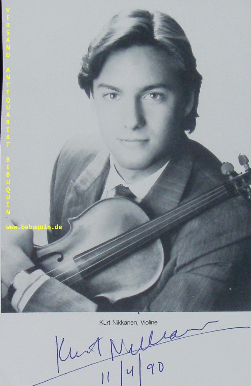 NIKKANEN, Kurt (Violinist): eigenhändig signierte und datierte schöne Portraitseite. München (Philharmonie), 11.4.1990. 18 x 11,5 cm. 1 Bl. American violinist Kurt Nikkanen is an international soloist of the highest order. Born in Hartford, Connecticut, he began his violin studies at the age of three, later studying with Roman Totenberg and Jens Ellerman. At twelve he gave his Carnegie Hall debut, performing with the New York Youth Symphony; two years later he was invited by Zubin Mehta to perform the Paganini Concerto No.1 with the New York Philharmonic for a Young People’s Concert. He studied with Dorothy DeLay at the Juilliard School. (Steinhardt)