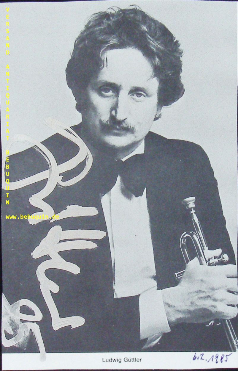 GÜTTLER, Ludwig (Trompeter): eigenhändig mit Silberstift signierte und datierte Portraitseite. München (Herkulessaal), 6.2.1985. 18 x 11,5 cm. 1 Bl. Ludwig Güttler (* 13. Juni 1943 in Sosa im Erzgebirge) ist ein deutscher Trompeter und Dirigent. Er gilt als einer der weltweit führenden Trompeten-Virtuosen. (Wikipedia)